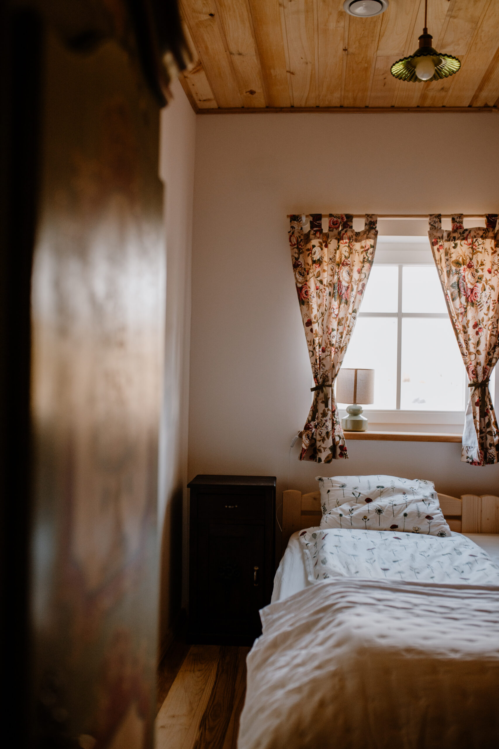 • Zabytkowa malowana we wzory szafka nocna, w jednej z sypialni, w Chacie Czerwonej. Obok szafki dwa pojedyncze łóżka. Na ścianie zabytkowy kinkiet. Okno z króką zasłoną w stylu rustykalnym.