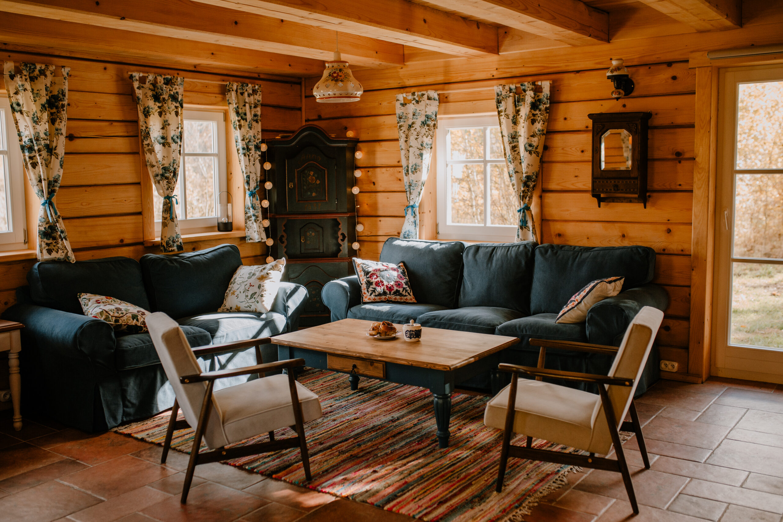 • Przytulny salon w Chacie Białej: dwie sofy, stolik kawowy, zabytkowa witryna i lampa z fajansu; dwa okna z rustykalnymi zasłonami w kwiaty; Chata Waliszów, Ziemia Kłodzka